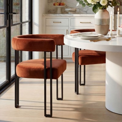 Upgrade your dining space with the Panipeachy Set of 4 Velvet Dining Chairs, where modern elegance meets everyday function. These low-profile armchairs feature a sculptural round barrel back that seamlessly flows into built-in armrests, offering both ergonomic comfort and a designer look. The open-back “floating” design creates visual space and brings an airy, modern feel to any dining room, kitchen, or apartment dining nook.