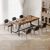 Highlights at a glance:Wood grain panels and sturdy metal legs blends industrial and farmhouse aesthetics effortlessly.Spacious dimensions comfortably accommodate 6 to 8 people, perfect for family meals or gatherings.Thick engineered wood with reinforced metal legs and additional support beams ensures exceptional stability and durability.The waterproof and anti-scratch surface ensures long-lasting beauty and easy maintenance.Double as an office or computer desk, seamlessly fitting into your living room or workspace.