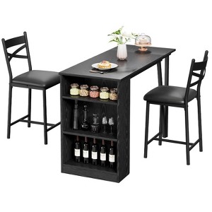 Feature:Crafted with a modern aesthetic, this counter-height bar table set features a sleek finish that complements any home style. The table is designed to extend by an additional 11.81 inches, allowing you to accommodate extra guests when entertaining or simply enjoying a meal. Whether hosting a dinner party or enjoying a casual breakfast, this dining table set with storage adapts to your needs, making it an ideal choice for compact living spaces.The kitchen table set includes two high stools that tuck neatly under the table when not in use, maximizing your floor space. This design is perfect for small dining areas, kitchens, home bars, or game rooms, ensuring you can enjoy a stylish dining experience without sacrificing space.Built to last, the table features a sturdy frame made from premium engineered wood and metal, supporting up to 300 lbs, while the chairs are designed with a robust metal frame and high-density sponge for added comfort, with a capacity of up to 150 lbs. The dining table set also includes additional 3 storage shelves, perfect for organizing your favorite beverages, tableware, or decorative items. With these shelves, everything you need is easily accessible, making your entertaining effortless and enjoyable.