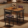 - Metal Corner Guards: This dining table set for 2 includes a counter-height table accompanied by 2 upholstered bar stools, ideal for enjoying meals or drinks with family and friends. The set is equipped with durable metal corner guards that protect against everyday bumps, maintaining its durability and pristine appearance over time. Its sleek design and attractive wood grain finish bring a stylish industrial flair that fits seamlessly into any home decor.