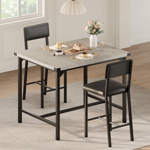 - Dining table set for 2 with Metal Corner Guards:This counter height table set includes a bar-height table and 2 cushioned bar chairs, perfect for sharing a meal or a drink with family and friends. This dining table set for 2 features a sturdy metal corner guards to effectively withstand daily bumps, ensuring long-lasting durability and a like-new look. The clean lines and elegant wood grain finish add a touch of industrial style that complements any home decor