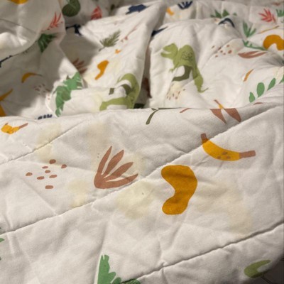 I love the light weighted quilt, the design is super cute EXCEPT the yellow splotchy “stain” look. The dinosaurs had to tinkle I guess. To whoever decided to incorporate the yellow stains, I hope your pillows are warm on both sides.