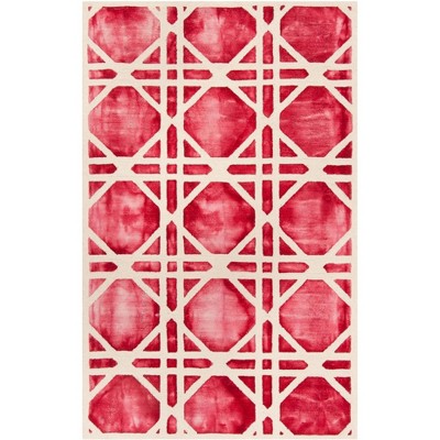 Introducing our exquisite 5' x 8' medium rectangle area rug, a harmonious blend of ivory and red that will elevate any room with its sophisticated charm. Artfully crafted in India, this rug showcases a captivating pattern that draws the eye with its organic lattice design, featuring interconnected shapes that create a sense of continuity and flow.