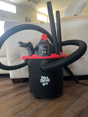 [This review was collected as part of a promotion.] I received the dirt devil 5 gallon wet/dry vacuum from Bzzagent for free, in exchange for writing this review. I had a previously large wet/dry vac that was very hard to move around and get into small spaces. This vacuum is such a good size. It's so easy to move around and so light to /carry. It has so many attachments that my other vac didn't. It may be small but has amazing suction. I have used it to clean my vehicle and cleanup a spill on the bedroom carpet. Very impressed with the results., The only thing that could be better is the cord, it's not very long. I needed an extension cord to use it. I would buy this again and 100% recommend this to anyone.