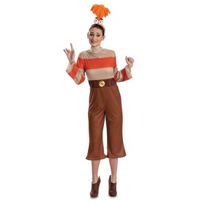 From the Disney/Pixar movie, Inside Out 2, comes our fun Women's Anxiety Deluxe Costume! Features a one-piece jumpsuit that looks like a long-sleeved striped shirt and brown flare leg cropped pants with a printed belt.. Comes with a cute character headpiece with big round eyes and an attached fuzzy plume on top..