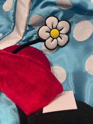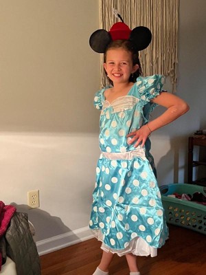 [This review was collected as part of a promotion.] I love everything about this Minnie costume. It is not the signature red or pink we see often on Minnie, it is a shimmering silky looking baby blue color with glittery polkas. It definitely makes the dress unique. The velvet hat with vinyl cartonized flower adds a nice finish touch to the whole outfit. Retro and fun. The back is elastic, the sizing is very accommodating. I got the medium size but I think it runs more like a large. I’m so ready for next Halloween to wear it.