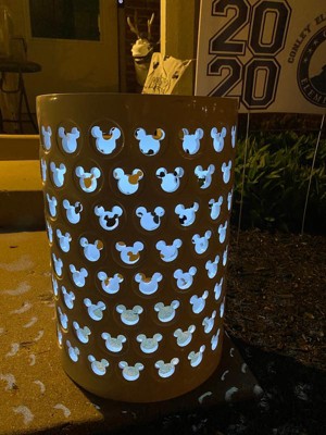 A: Read the reviews on the red colored version of this. Apparently, there's a bulb inside that throws lighted Mickey icons onto surrounding fences & walls.