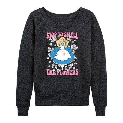 Women's Disney Alice in Wonderland Lightweight French Terry Wide Neck Long Sleeve Graphic Shirt - Heather Charcoal - Small