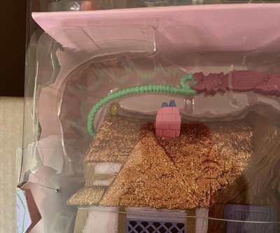- Inside of cottage includes Aurora's dress which turns from blue to pink when swiveled.