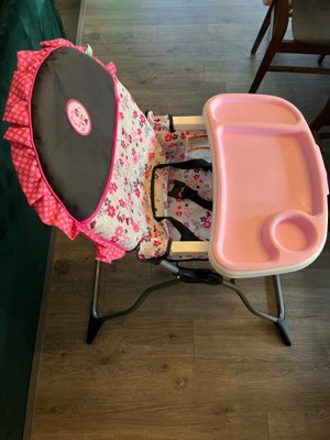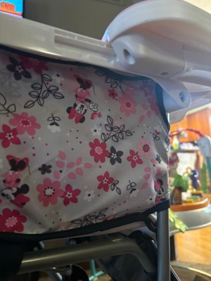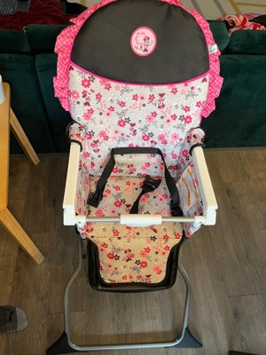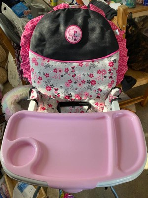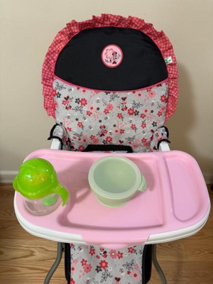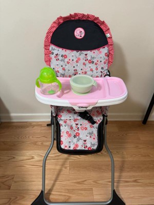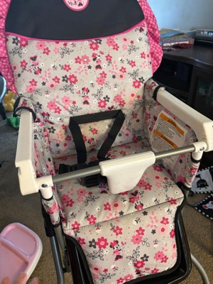 I received the Disney Baby Minnie Simple Fold Plus High Chair from the Stellar Product Testing Panel and was so excited to let my daughters try it. We are huge Disney fans and my daughters adore Minnie Mouse, so the design of this high chair was a big hit. The "Minnie Garden Delight" color is a pink and grey floral print. Although this high chair has many pros, there were also some cons which is why I rated it only 3 stars. I would first like to mention that this high chair is great value for the price and it is an affordable and functional compact option. You have to assemble the high chair but it takes about 10 min. What I love the most is how easy and quickly it is to fold and unfold this high chair. We live in a small home and don't have a lot of room and this high chair is a space-saver! It is so easy to fold and store when not in use and just as easy to open it back up for meal times. It also stands on it's own when folded. The high chair is lightweight and under 13 lbs. Other pros include the removable tray insert (dishwasher-safe), a footrest (but not adjustable) and has a weight limit of 50 lbs. Both my 1 and 3 year old can sit comfortably on this chair but they are also on the smaller side. Now for the cons... the biggest con for me is that the seat cover and straps are non-removable and can't be taken apart to wash. It is wipe clean only which may not be the best for a very messy toddler or if you plan on doing baby led weaning. We have used this high chair a few times and so far it has been fine wiping the chair clean, though I'm not sure how well it'll hold up if you get pasta sauce on it. Another con is that the table tray is smaller than average. The high chair has a weight limit of up to 50 lbs and can be used for babies 4 months and up, but I'm not sure how comfortable it'll be for larger toddlers due to the compact size or younger babies who cannot sit up without support. The chair has a slight recline position that is not adjustable.