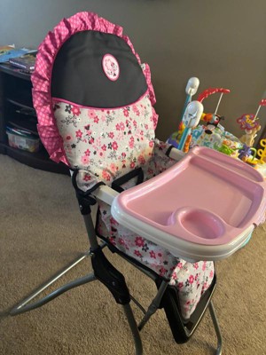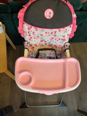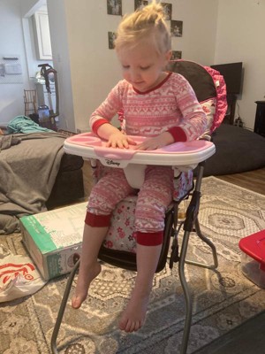 The Disney Minnie Simple Fold Plus High Chair is a really great compact high chair option. I received this high chair for being part of the Stellar Product Testing Panel and my twin girls love the cute pink chair pad and pink tray insert, and will fight over who gets to sit in it! The high chair is so easy to set up and folds up very quickly and can be stored away in smaller spaces really easily. The chair is on the smaller side but my 3 year old girls still fit in it very nicely, and you can fit a child's plate on both the removable insert and tray. I love that both the tray and insert fit easily in the dishwasher. Most high chair trays say they are dishwasher safe but they are so large that you are not really able to put them in the dishwasher unless it it basically empty. The high chair does not really have any options for adjusting the height or position of the seat back, however, I do not find that I every really use those options anyway so this high chair works perfect for us. The tray portion is really easy to take on and off and has multiple positions, but the chair pad is not easily removed so it would be difficult to clean if there was a big spill or mess. Overall the Disney Minnie Simple Fold Plus High Chair really is so simple to set and then fold and tuck away, it is nice and sturdy and is a great option for anyway who needs to save space or wants to transition toddlers into something a little smaller, more mobile, and easy to stow away.