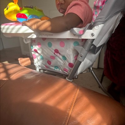 We received this chair as part of the Stellar Product Testing panel. This chair is adequate. It doesn't have any bells or whistles but it is light weight, folds up compact and is easy to clean. All of which are important. The biggest negatives are that the height is not adjustable, so as your child gets older and might want to sit at the table instead of use the tray, it's not likely to fit under your table. I do like the added safety bar that keeps the child from leaning forward out of the chair.