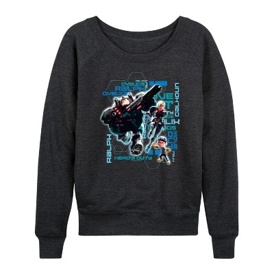 Women's Disney Collage OF Friends Lightweight French Terry Wide Neck Long Sleeve Graphic Shirt - Heather Charcoal - Medium