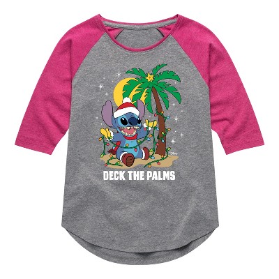 Lilo & Stitch - Deck The Palms Christmas - Women's Short Sleeve Graphic T-Shirt - Celebrate the ohana with Lilo & Stitch graphic apparel, blending new visuals with classic heartwarming moments featuring Lilo, Stitch, and the bonds of family.