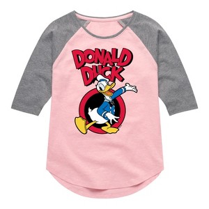 Mickey & Friends - Donald Duck - Toddler And Youth Girls Raglan Graphic T-Shirt - Add a touch of magic to your wardrobe with this graphic apparel featuring iconic Disney designs. Showcasing beloved characters and classic imagery, each piece combines nostalgic charm with modern style—perfect for Disney fans of all ages. Whether you're headed to the parks or just adding whimsy to your everyday look, these graphics bring the magic to life.
