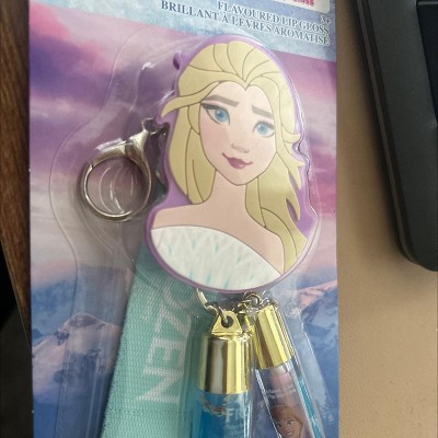 - Set includes strawberry flavored mini lip gloss tube, grape flavored mini lip gloss wand, and one Elsa lanyard keychain.