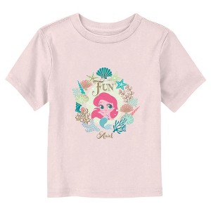 • The smallest family members are also the most stylish with this new toddlers' t-shirt that is perfect for every occasion! FeaturingAriel portrayed as a baby with big green eyes, framed by starfish, shells, and seaweed, along with the word "Fun."