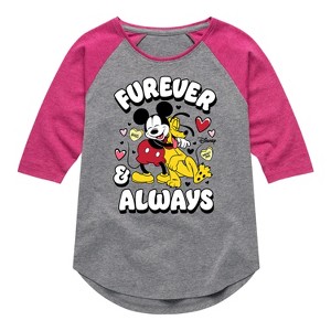 Disney - Furever And Always - Toddler & Youth Girls Raglan Graphic T-Shirt - Add a touch of magic to your wardrobe with this graphic apparel featuring iconic Disney designs. Showcasing beloved characters and classic imagery, each piece combines nostalgic charm with modern style—perfect for Disney fans of all ages. Whether you're headed to the parks or just adding whimsy to your everyday look, these graphics bring the magic to life.