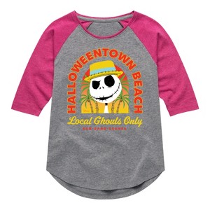 Nightmare Before Christmas - Halloweentown Beach - Local Ghouls Only - Sun Sand & Scares - Toddler And Youth Girls Raglan Graphic T-Shirt - Add a touch of magic to your wardrobe with this graphic apparel featuring iconic Disney designs. Showcasing beloved characters and classic imagery, each piece combines nostalgic charm with modern style—perfect for Disney fans of all ages. Whether you're headed to the parks or just adding whimsy to your everyday look, these graphics bring the magic to life.
