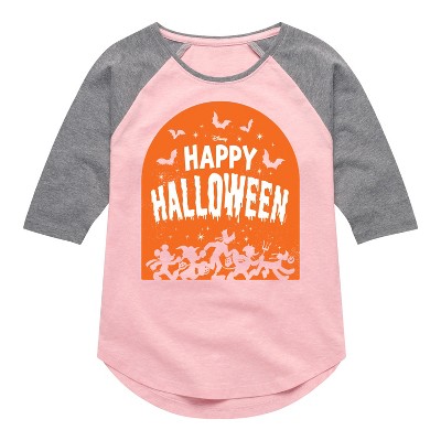 Mickey & Friends - Happy Halloween Pumpkin - Toddler And Youth Girls Raglan Graphic T-Shirt - Add a touch of magic to your wardrobe with this graphic apparel featuring iconic Disney designs. Showcasing beloved characters and classic imagery, each piece combines nostalgic charm with modern style—perfect for Disney fans of all ages. Whether you're headed to the parks or just adding whimsy to your everyday look, these graphics bring the magic to life.