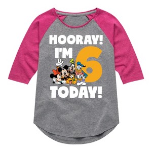 Mickey & Friends - Hooray I'm 6 Today - Toddler And Youth Girls Raglan Graphic T-Shirt - Add a touch of magic to your wardrobe with this graphic apparel featuring iconic Disney designs. Showcasing beloved characters and classic imagery, each piece combines nostalgic charm with modern style—perfect for Disney fans of all ages. Whether you're headed to the parks or just adding whimsy to your everyday look, these graphics bring the magic to life.