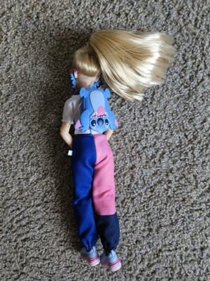 This Disney ily 4EVER doll, inspired by Stitch from Disney's Lilo and Stitch, is positively excited for the big home game. With her sporty varsity jacket, denim shorts, and a cute upside-down Stitch-inspired backpack, she's ready to cheer for her team. Her blue cropped hoodie with Stitch graphic reminding us that Ohana means family, fits so well under her two-tone jacket. A pair of Stitch-inspired earrings and blue with white platform sneakers complete her sporty look!