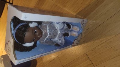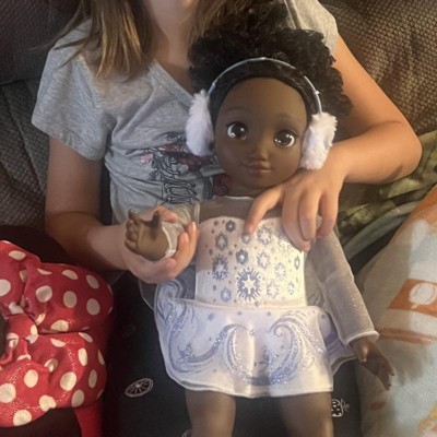 Be inspired by your Disney faves! Disney ily 4EVER 18-inch dolls have all the Disney looks you love! Inspired by Olaf, this ice-skating star is ready to take a spin on the ice! She has dark curly hair and beautiful brown eyes. Purple glitter print snowflakes and Olaf icons adorn this beautiful, snow-colored Olaf-inspired ice-skating outfit with sheer sleeves and velvet bodice. A pair of fuzzy earmuffs and white Olaf-inspired ice skates complete her look!