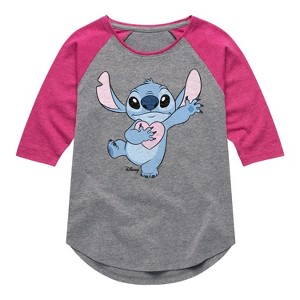 Disney - Lilo & Stitch - Stitch Hearts You - Toddler & Youth Girls Raglan Graphic T-Shirt - Add a touch of magic to your wardrobe with this graphic apparel featuring iconic Disney designs. Showcasing beloved characters and classic imagery, each piece combines nostalgic charm with modern style—perfect for Disney fans of all ages. Whether you're headed to the parks or just adding whimsy to your everyday look, these graphics bring the magic to life.