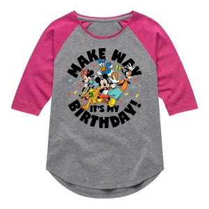 Mickey & Friends - Make Way It's My Birthday - Toddler And Youth Girls Raglan Graphic T-Shirt - Add a touch of magic to your wardrobe with this graphic apparel featuring iconic Disney designs. Showcasing beloved characters and classic imagery, each piece combines nostalgic charm with modern style—perfect for Disney fans of all ages. Whether you're headed to the parks or just adding whimsy to your everyday look, these graphics bring the magic to life.