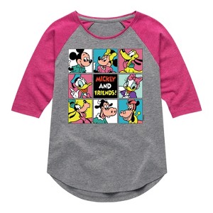 Mickey & Friends - Mickey And Friends Grid - Toddler And Youth Girls Raglan Graphic T-Shirt - Add a touch of magic to your wardrobe with this graphic apparel featuring iconic Disney designs. Showcasing beloved characters and classic imagery, each piece combines nostalgic charm with modern style—perfect for Disney fans of all ages. Whether you're headed to the parks or just adding whimsy to your everyday look, these graphics bring the magic to life.