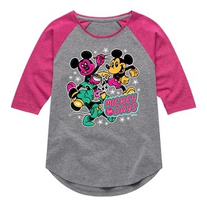 Disney - Mickey Collage - Toddler & Youth Girls Raglan Graphic T-Shirt - Add a touch of magic to your wardrobe with this graphic apparel featuring iconic Disney designs. Showcasing beloved characters and classic imagery, each piece combines nostalgic charm with modern style—perfect for Disney fans of all ages. Whether you're headed to the parks or just adding whimsy to your everyday look, these graphics bring the magic to life.