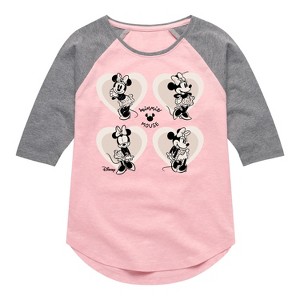 Disney - Mickey & Friends - Minnie Mouse - Sweet Innocent Poses - Toddler And Youth Girls Raglan Graphic T-Shirt - Add a touch of magic to your wardrobe with this graphic apparel featuring iconic Disney designs. Showcasing beloved characters and classic imagery, each piece combines nostalgic charm with modern style—perfect for Disney fans of all ages. Whether you're headed to the parks or just adding whimsy to your everyday look, these graphics bring the magic to life.