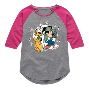 Disney - Mickey & Friends - Pluto & Mickey Listening to Music - Toddler And Youth Girls Raglan Graphic T-Shirt - Add a touch of magic to your wardrobe with this graphic apparel featuring iconic Disney designs. Showcasing beloved characters and classic imagery, each piece combines nostalgic charm with modern style—perfect for Disney fans of all ages. Whether you're headed to the parks or just adding whimsy to your everyday look, these graphics bring the magic to life.