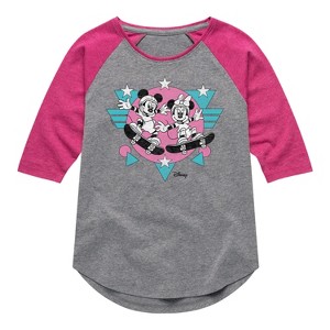 Disney - Mickey & Friends - Retro Skaters Mickey & Minnie - Toddler And Youth Girls Raglan Graphic T-Shirt - Add a touch of magic to your wardrobe with this graphic apparel featuring iconic Disney designs. Showcasing beloved characters and classic imagery, each piece combines nostalgic charm with modern style—perfect for Disney fans of all ages. Whether you're headed to the parks or just adding whimsy to your everyday look, these graphics bring the magic to life.