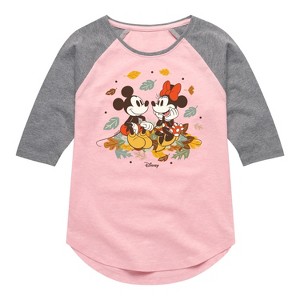 Girls' - Disney - Mickey Minnie Leaf Pile Shirt Tail Raglan Graphic T-shirt - 1 of 3