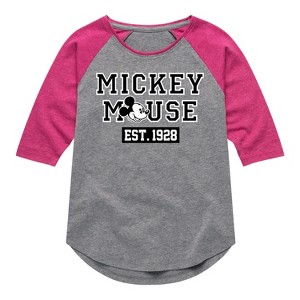 Mickey & Friends - Mickey Mouse Est 1928 - Toddler And Youth Girls Raglan Graphic T-Shirt - Add a touch of magic to your wardrobe with this graphic apparel featuring iconic Disney designs. Showcasing beloved characters and classic imagery, each piece combines nostalgic charm with modern style—perfect for Disney fans of all ages. Whether you're headed to the parks or just adding whimsy to your everyday look, these graphics bring the magic to life.