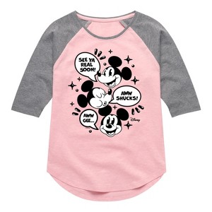 Disney - Mickey Mouse - See Ya Soon!, Aww Shucks!, Aww Gee - Toddler & Youth Girls Raglan Graphic T-Shirt - Add a touch of magic to your wardrobe with this graphic apparel featuring iconic Disney designs. Showcasing beloved characters and classic imagery, each piece combines nostalgic charm with modern style—perfect for Disney fans of all ages. Whether you're headed to the parks or just adding whimsy to your everyday look, these graphics bring the magic to life.
