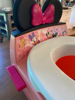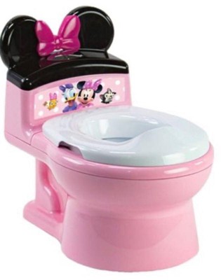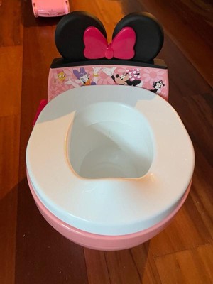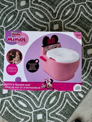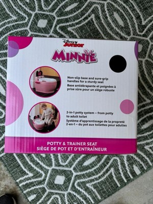 [This review was collected as part of a promotion.] This Disney Mini Mouse 2 - in -1 Potty is a nice potty training potty it's very cute. The little handle that actually flushes is adorable. The potty pot comes out easy to dump and clean. The potty seat comes off and fits on most standard toilet seats. I did not care for the transition seat it didn't fit well on my toilet seat it moves very easy making it " scary " but I love the concept here making the transition from the little potty to the big potty easier. So all in all it's cute, light, easy to clean training potty. One thing I would change is the picture behind the seat ( the Mini, and Daisy cheering ) is a paper type style sticker, if your cleaning your potty regularly and using a cleaning product this sticker won't last. However with this potty we were potty trained, and using the big potty " no accidents " in less than a week!