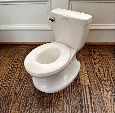 [This review was collected as part of a promotion.] This little toilet is super cute. My little one was immediately drawn to it. It's light and portable. Comes with a seat to put on the bathroom toilet. Loved the flushing sounds. Gets them use to using a regular toliet.easy to clean.