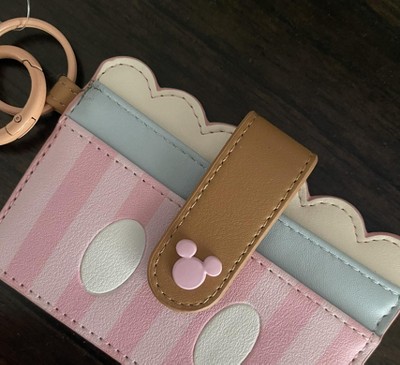 Add a touch of whimsy to your accessories with this pink Disney Mickey Mouse card wallet. The wallet showcases Mickey with sprinkles on the front and a playful pink striped Mickey shorts design on the back. It features a snap closure for secure storage and is adorned with a Mickey head rubber wristlet and a pink faux fur pom pom. Made with durable PU and rubber materials, this wallet measures 10 CM W x 7.5 CM H. For effortless care, simply wipe it clean to maintain its charm.