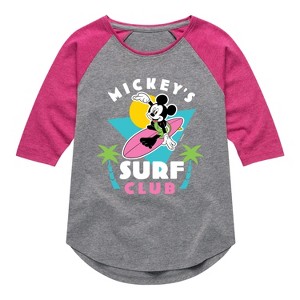 Mickey & Friends - Mickey's Surf Club - Toddler And Youth Girls Raglan Graphic T-Shirt - Add a touch of magic to your wardrobe with this graphic apparel featuring iconic Disney designs. Showcasing beloved characters and classic imagery, each piece combines nostalgic charm with modern style—perfect for Disney fans of all ages. Whether you're headed to the parks or just adding whimsy to your everyday look, these graphics bring the magic to life.