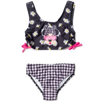 Get ready for a fun day in this cute Minnie Mouse swimsuit. This stylish two-piece bathing suit set features your girl's favorite Disney character and designs she will love, such as pretty pink ruffles, a fun polka-dot print, colorful tie-dye, an all-over floral print, and fourth of July stars and stripes! Made of a quick-drying material that is comfortable to wear in and out of the water, this sun-protecting swimming suit is the perfect summer essential for your Disney fan.