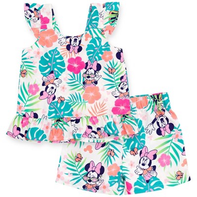 Let Minnie Mouse add a twirl of fun to your little one's summer days with this sweet tank and shorts set! The sleeveless top features ruffle-trimmed shoulders and playful Minnie graphics, while the matching shorts offer a comfy elastic waist and allover print for extra charm. Made from lightweight, easy-care polyester, this outfit is perfect for park play, outdoor fun, or just spinning around the living room. Minnie magic, made for movement and smiles!