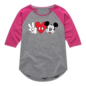 Mickey & Friends - Peace Love Mickey - Toddler And Youth Girls Raglan Graphic T-Shirt - Add a touch of magic to your wardrobe with this graphic apparel featuring iconic Disney designs. Showcasing beloved characters and classic imagery, each piece combines nostalgic charm with modern style—perfect for Disney fans of all ages. Whether you're headed to the parks or just adding whimsy to your everyday look, these graphics bring the magic to life.