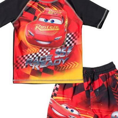 On your mark, get set, go! Race off to Radiator Springs for a day filled with fun adventures in this cool Disney Pixar Cars swim set! This stylish short sleeve rash guard shirt and swim shorts set features a comfy 4-way stretch fabric top, bottoms with a secure elastic waist and an adjustable drawstring closure, and vibrant artwork of your kid's favorite cars, racing legend Lightning McQueen or his friend Tow Mater! Made of a quick-drying material that is comfortable to wear in and out of the water, this sun-protecting bathing suit is the perfect summer essential for your Disney fan!
