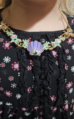 - Gold chain necklace with shell pendant and under the sea-themed “jewels”