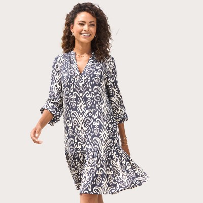- All over print design; Cute and stylish flutter sleeves; Button closure down back of garment for easy dressing; Fashionable tiered ruffle hem; Charming and delicate Swiss dot fabric adding a textured dotted pattern to this style.