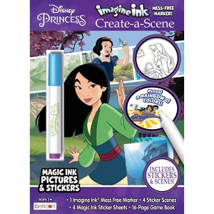 Reveal a rainbow of colors on every page with Bendon’s Disney Princess Imagine Ink® Magic Ink Pictures & Stickers Pad! This patented technology magically reveals a rainbow of colors with just one Magic Ink marker. Your little artist will love finding favorite Disney Princesses characters with bonus Magic Ink stickers and sticker play scenes, and you'll love the magic of mess-free coloring! Includes 16-page Magic Ink Pictures Book, 4 Magic Ink Sticker Sheets, 4 sticker play scenes, and 1 Mess-Free Imagine Ink® marker in a portable size that's great for travel. Imagine Ink® markers are invisible on most household surfaces. This is an official Disney licensed product ideal for ages 3 and up. Disney Princesses include Ariel, Jasmine, Belle, Cinderella and more!