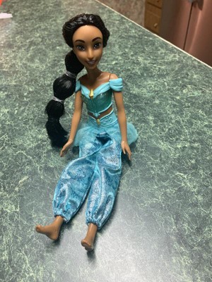 Meet this Princess Jasmine doll, inspired by the generous and daring heroine from Disney's Aladdin. This posable fashion doll is shown in a sparkling outfit and accessories that include shoes and a tiara. In her signature look from the movie, this Jasmine doll is ready for any adventure! Doll cannot stand alone. Colors and decorations may vary.