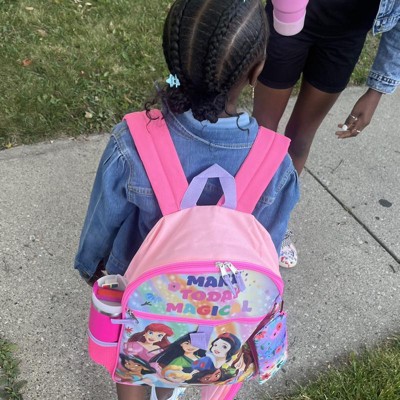 BACKPACK: The 16" backpack has been custom designed to feature bright, colorful graphics of "Make Today Magical" and favorite princesses like Cinderella, Mulan, and Belle. A large front zippered pocket keeps smaller objects within easy reach, while the mesh water bottle pocket helps your little one stay hydrated throughout the day.